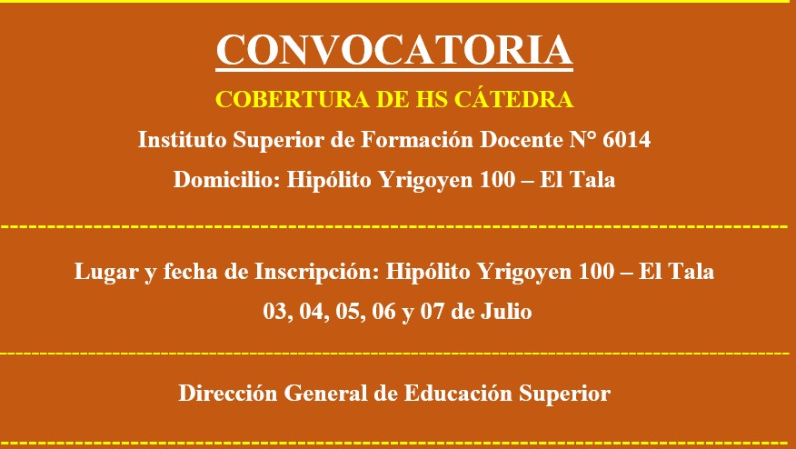 CONVOCATORIA PARA LA COBERTURA DE HS CÁTEDRA IES 6014 DE EL TALA