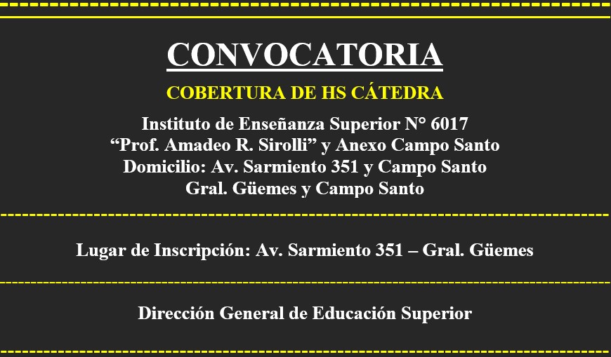CONVOCATORIA PARA LA COBERTURA DE HS CÁTEDRA IES 6017 y Anexo – Gral. Güemes y Campo Santo