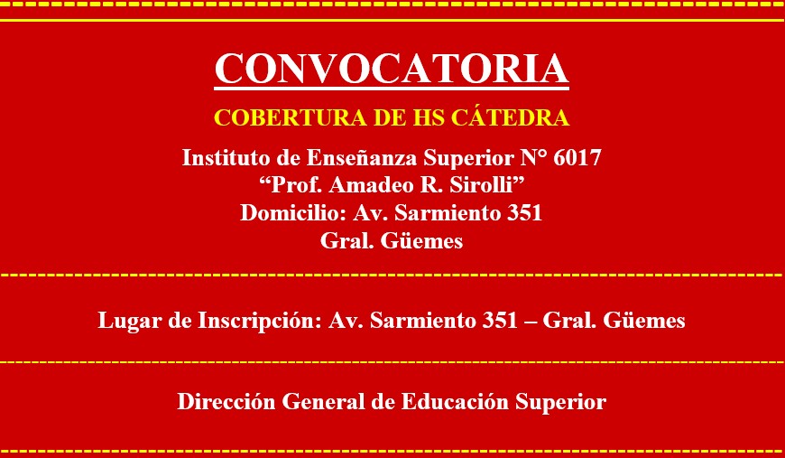 CONVOCATORIA PARA LA COBERTURA DE HS CÁTEDRA IES 6017 DE GRAL. GÜEMES