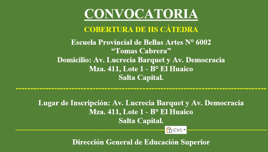 CONVOCATORIA PARA LA COBERTURA DE HS CATEDRA IES 6002 DE SALTA CAPITAL