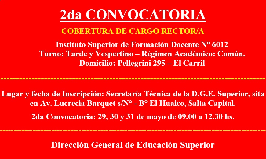 2da CONVOCATORIA A CONCURSO CARGO DE RECTOR/A PARA EL IES N° 6012 DE EL CARRIL