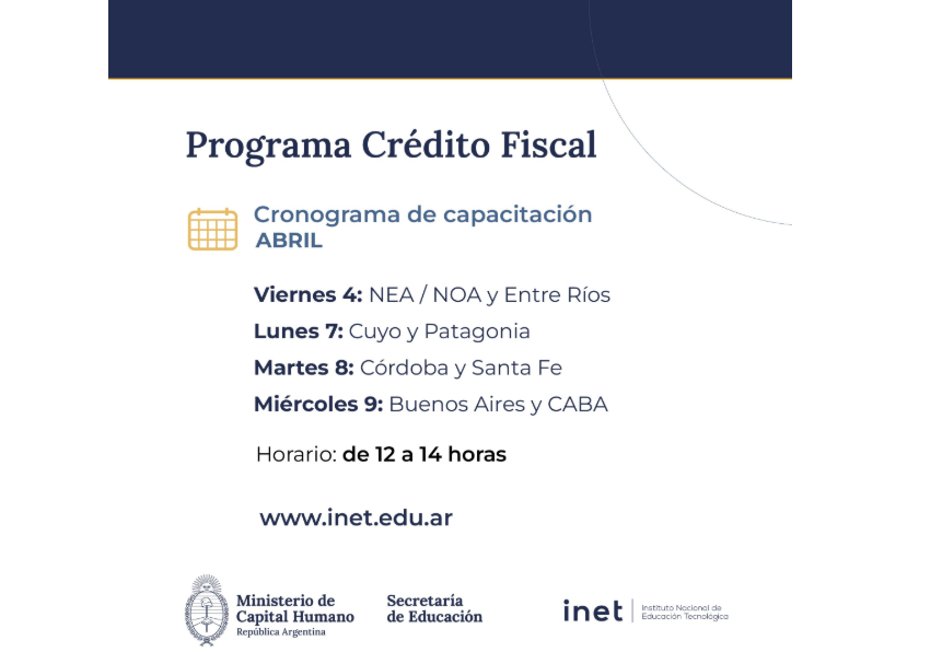 El Instituto Nacional de Educación Tecnológica (INET) perteneciente a la Secretaría de Educación del Ministerio de Capital Humano de la Nación, anunció el inicio de las capacitaciones correspondientes al programa de Crédito Fiscal, una iniciativa clave para fortalecer la Educación Técnico Profesional (ETP) y la vinculación con el sector productivo del país. Los encuentros se realizaránSigue leyendo «CRÉDITO FISCAL 2025: CAPACITACIONES PARA LA PRESENTACIÓN DE PROYECTOS»