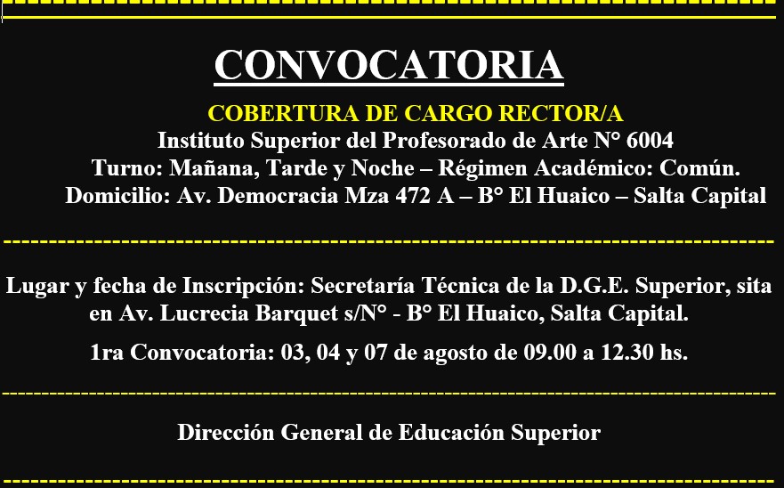 PRIMERA CONVOCATORIA A CONCURSO DE CARGO DE RECTOR/A PARA EL INSTITUTO SUPERIOR DE PROFESORADO DE ARTE N° 6004 DE SALTA CAPITAL