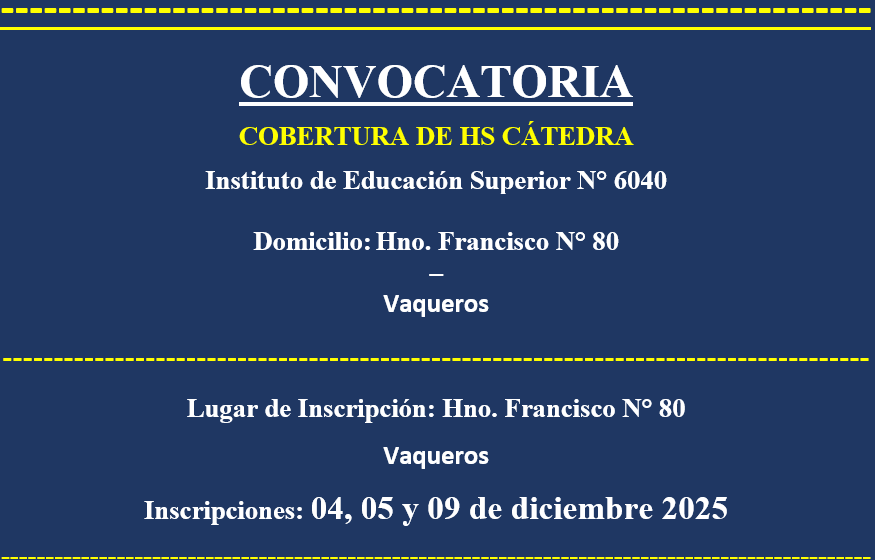 CONVOCATORIA PARA LA COBERTURA DE HS CÁTEDRA IES 6040 DE VAQUEROS Y LA CALDERA