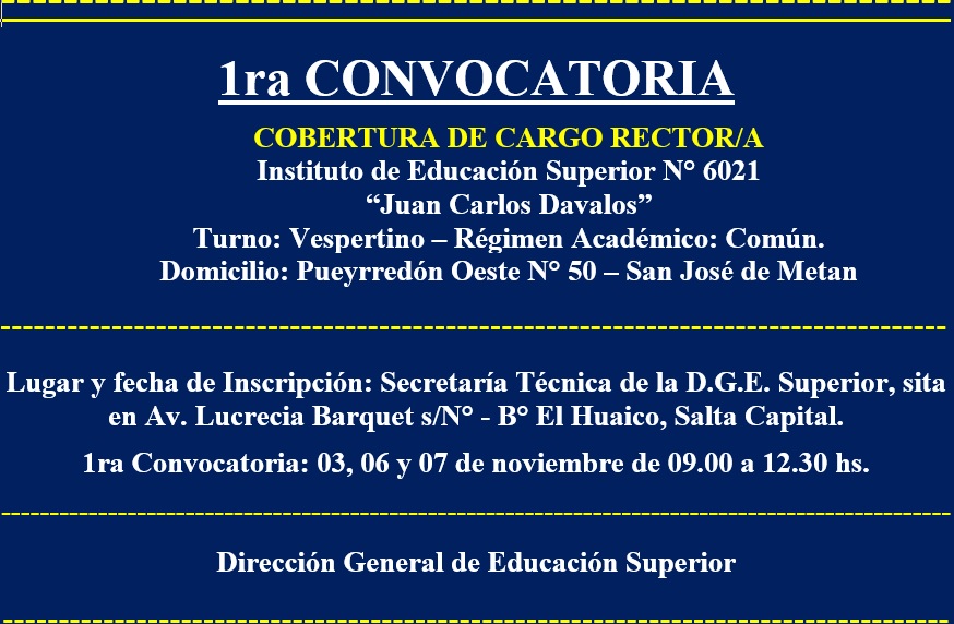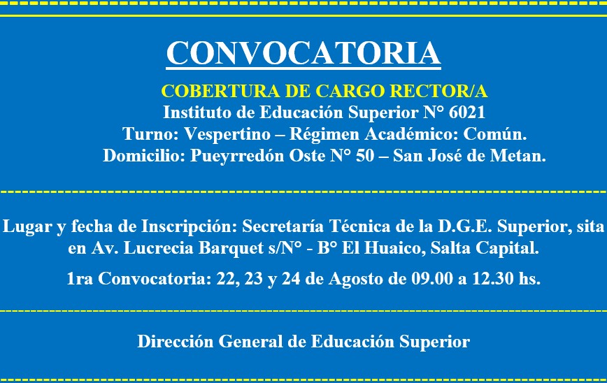 PRIMERA CONVOCATORIA A CONCURSO DE CARGO DE RECTOR/A INSTITUTO DE EDUCACIÓN SUPERIOR N° 6021