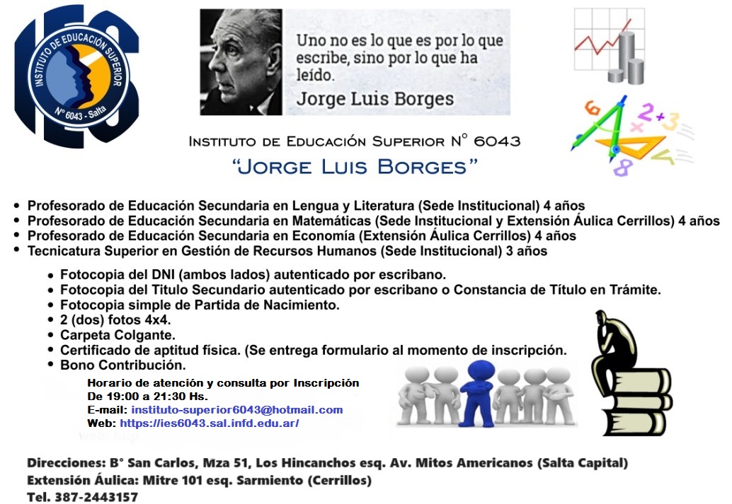 Desde el 11 al 15 de diciembre de 19:00 a 21:30 Hs. te podés acercar al Instituto y a su Extensión Áulica en Cerrillos, para inscribirte y arrancar a estudiar. Es una Institución de Gestión Estatal. Sede Institucional: B° San Carlos, Mza. 51, Los Hincanchos esq. Av. Mitos Americanos (Salta Capital) Extensión Áulica: Mitre 101Sigue leyendo «ABRE INSCRIPCIONES EL INSTITUTO DE EDUCACIÓN SUPERIOR N° 6043 “JORGE LUIS BORGES”»
