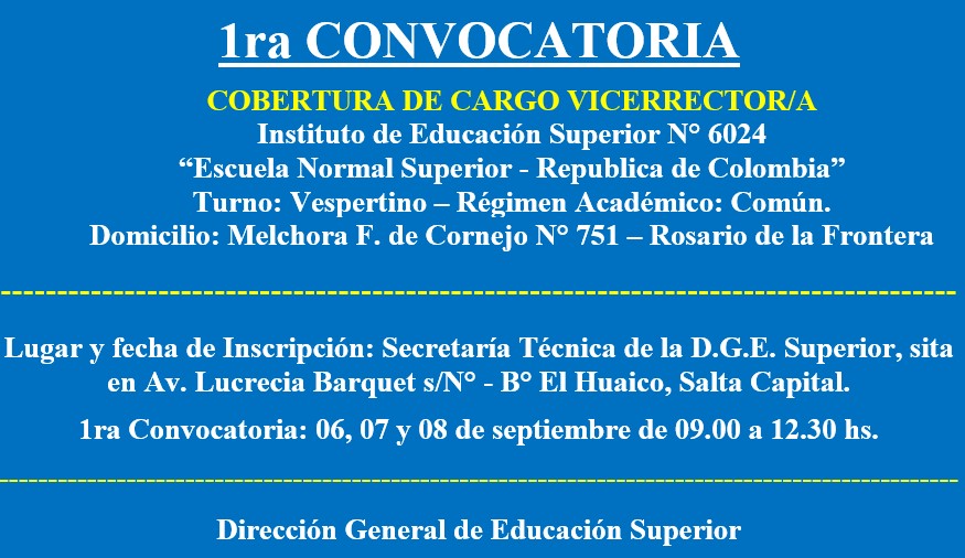 PRIMERA CONVOCATORIA A CONCURSO DE CARGO DE VICERRECTOR INSTITUTO DE EDUCACIÓN SUPERIOR N° 6024 “ESCUELA NORMAL SUPERIOR REPUBLICA DE COLOMBIA” DE ROSARIO DE LA FRONTERA