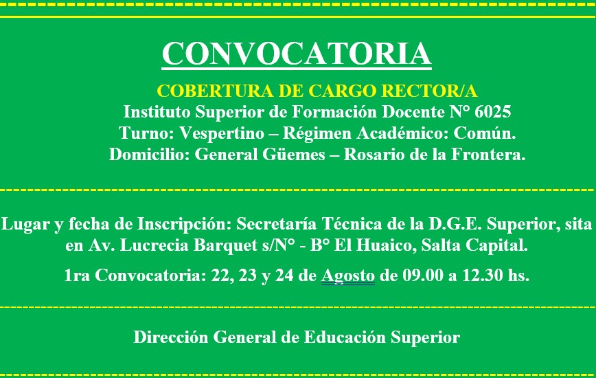 PRIMERA CONVOCATORIA A CONCURSO DE CARGO DE RECTOR/A INSTITUTO SUPERIOR DE FORMACIÓN DOCENTE N° 6025