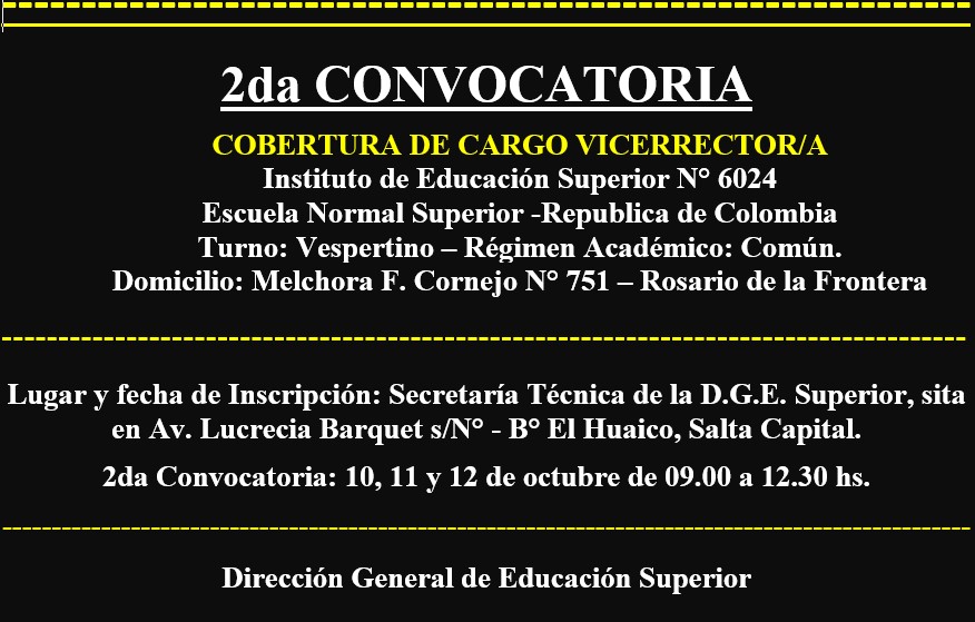 SEGUNDA CONVOCATORIA A CONCURSO DE CARGO DE VICERRECTOR PARA EL INSTITUTO DE EDUCACIÓN SUPERIOR N° 6024 DE ROSARIO DE LA FRONTERA