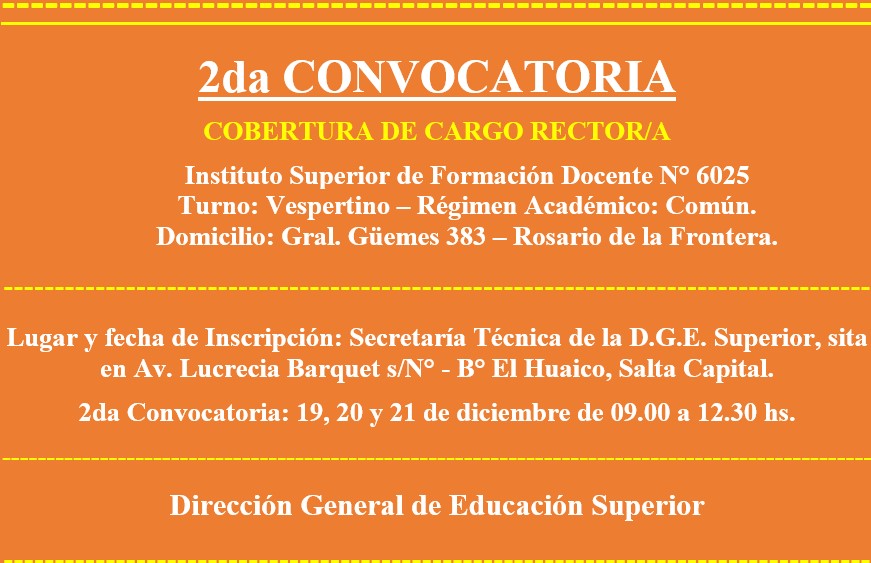 SEGUNDA CONVOCATORIA A CONCURSO DE CARGO DE RECTOR PARA EL INSTITUTO SUPERIOR DE FORMACIÓN DOCENTE N° 6025