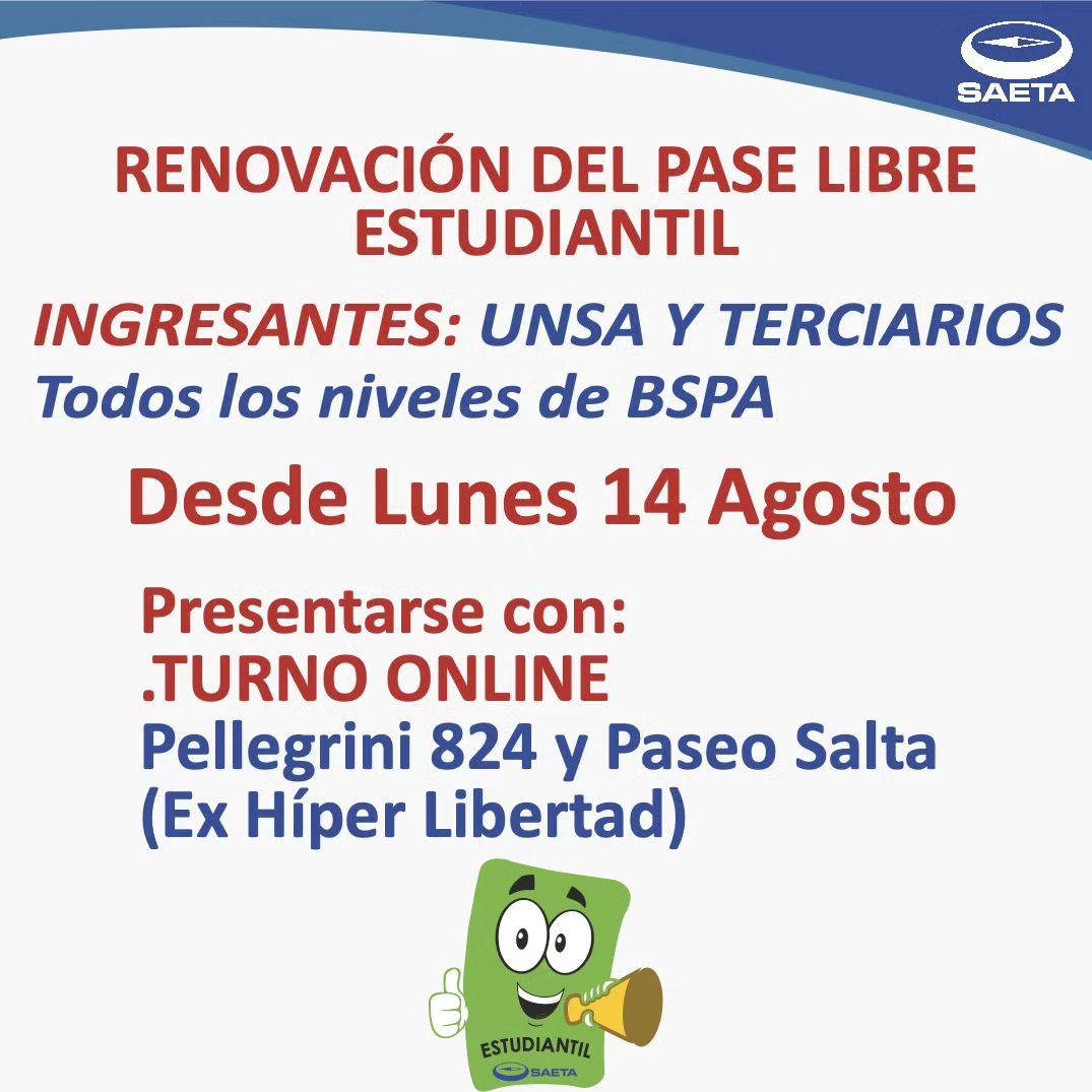 SAETA informa a alumnos ingresantes de la Universidad Nacional de Salta, ingresantes de nivel Terciario y de todos los niveles del BSPA, que desde este lunes 14 de agosto podrán realizar el trámite de renovación del Pase Libre Estudiantil ya que la gratuidad quedará suspendida desde el domingo 20. Esta actualización es la última delSigue leyendo «ÚLTIMA RENOVACIÓN DE PASE LIBRE PARA INGRESANTES DE LA UNSA Y DE TERCIARIOS Y DE TODOS LOS BSPA.»