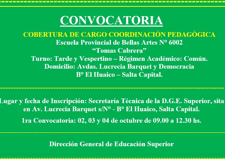 PRIMERA CONVOCATORIA A CONCURSO DEL CARGO DE COORDINADOR PEDAGÓGICO PARA LA ESCUELA PROVINCIAL DE BELLAS ARTES “TOMAS CABRERA”
