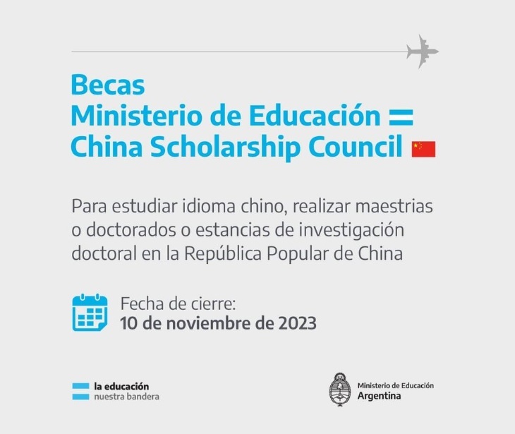 El Ministerio de Educación de la Nación y el China Scholarship Council abrieron la convocatoria para ciudadanas y ciudadanos argentinos que deseen realizar estudios de maestría o doctorado, estancias de investigación doctoral o cursos de perfeccionamiento de idioma chino en China, durante el ciclo lectivo 2024-2025. Esta propuesta de formación es fruto del Memorándum deSigue leyendo «MINISTERIO DE EDUCACIÓN OFRECE BECAS PARA ESTUDIAR EN LA REPUBLICA POPULAR DE CHINA»