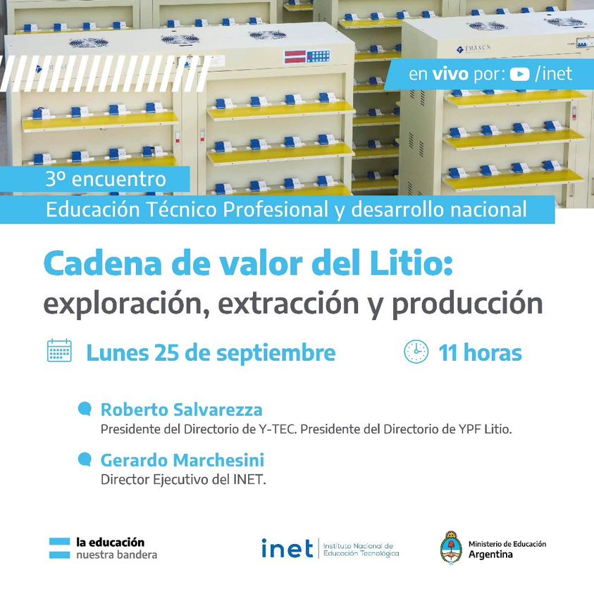 En el marco del Ciclo de seminarios: Educación Técnico Profesional y Desarrollo Nacional – INET se realizará el 3º encuentro: “Cadena de valor del Litio: exploración, extracción y producción” Se realizar el Lunes 25 de septiembre desde las 11:00 hs. Precencialmente se realizara en Saavedra 789 – CABA Se trasmitira en vivo por https://www.youtube.com/@INETetp Disertante: Roberto SalvarezzaSigue leyendo «3º ENCUENTRO: CADENA DE VALOR DEL LITIO. EXPLORACIÓN, EXTRACCIÓN Y PRODUCCIÓN»