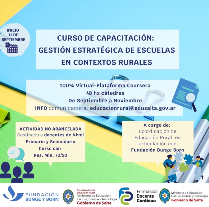 El Ministerio de Educación, Cultura, Ciencia y Tecnología de Salta, a través de la Coordinación de Educación Rural y en articulación con el equipo de la Fundación Bunge Born- Fundación Pérez Companc – Programa Sembrador, invitan a participar del curso de capacitación docente denominado “Gestión Estratégica de escuelas en contextos rurales». El cual, está destinadoSigue leyendo «CURSO DE CAPACITACIÓN DOCENTE: GESTION ESTRATÉGICA DE ESCUELAS EN CONTEXTOS RURALES»