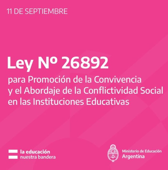 Esta ley regula la convivencia en las escuelas y busca reducir los conflictos en la comunidad educativa. Aprobada el 11 de septiembre de 2013, la Ley N.º 26.892 impulsa la promoción de un abordaje integral de la convivencia escolar y la prevención de las situaciones de conflictividad o violencia en las escuelas. Compartimos información sobre el tema ySigue leyendo «ANIVERSARIO DE LA SANCIÓN DE LA LEY PARA LA PROMOCIÓN DE LA CONVIVENCIA Y EL ABORDAJE DE LA CONFLICTIVIDAD»