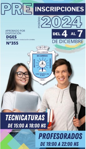 Desde el 04 al 07 de diciembre te podés acercar al Instituto, sito en Betty Cornejo y Los lapachos, B° 447 Viviendas en Gral. Enrique Mosconi, para inscribirte y arrancar a estudiar en 2024. Es una Institución de Gestión Estatal. Las carreras que oferta son Tecnicaturas y Profesorados: Tecnicaturas: Tecnicatura Superior en Higiene y SeguridadSigue leyendo «ABREN LAS PREINSCRIPCIONES 2024 EN EL INSTITUTO DE CARRERAS SUPERIORES N° 6016 “CONSCRIPTO RICARDO ARMANDO PAZ” DE GRAL. ENRIQUE MOSCONI»