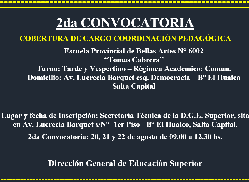 SEGUNDA CONVOCATORIA A CONCURSO DE CARGO DE COORDINADOR PEDAGÓGICO PARA LA ESCUELA PROVINCIAL DE BELLAS ARTES N° 6002 “TOMAS CABRERA” – SALTA CAPITAL