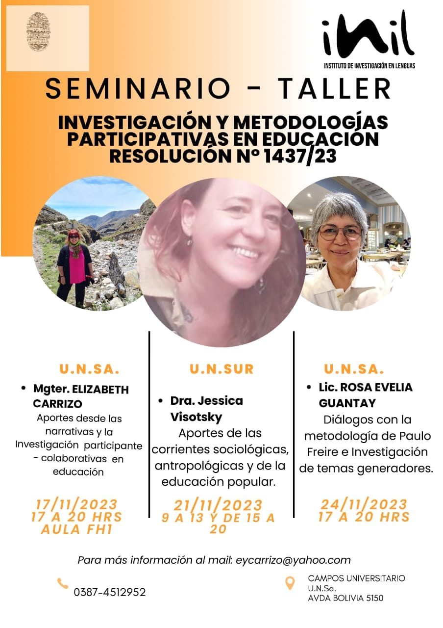 La Universidad Nacional de Salta (UNSa) y el Instituto de Investigación en Lenguas te invitan al Seminario Taller sobre Investigación y Metodologías Participativas en Educación. Disertantes: Fecha: Próximamente. Lugar: Campo Universitario U.N.Sa., ubicado en Av. Bolivia 5150. Para obtener más información sobre el seminario taller, puedes contactar a Mgter. Elizabeth Yolanda Carrizo a través delSigue leyendo «SEMINARIO TALLER: Investigación y metodologías participativas en educación»